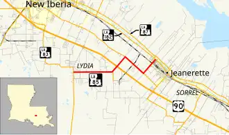 From the west, LA 85 begins at an intersection with LA 83 between New Iberia and Weeks Island in an area known as Lydia. It proceeds east along Patoutville Road through a residential neighborhood. After 0.5 miles (0.80 km), the route leaves Lydia, and the surroundings abruptly change to rural farmland with scattered residential development. 2.5 miles (4.0 km) later, LA 85 turns to the northeast and intersects LA 673, which heads south a short distance to Patoutville. Shortly afterward, LA 85 passes through an interchange with US 90 (the future corridor of I-49), which connects to Lafayette on the northwest and Morgan City on the southeast.[2][3][4]