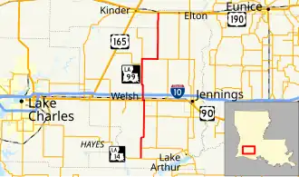 The route through Welsh was changed less than a year following the 1955 renumbering.[9][10] LA 99 now proceeded due north from LA 1126 directly to US 90 via Simmons Street. This eliminated several right-angle turns along the route but also necessitated a brief jog onto US 90 in order to proceed north onto Adams Street.[13] The route of LA 99 has otherwise remained the same to the present day.[3][13] However, a major improvement occurred when I-10 was constructed through the area in the early 1960s. The interstate was opened to traffic westward from Welsh to US 165 in Iowa in December 1963, partially opening the interchange with LA 99. The interchange was completed with the opening of the section from Welsh eastward to Jennings the following spring.[14]