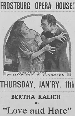 Love and Hate is a lost[1] 1916 silent film directed by James Vincent and starring Bertha Kalich. It was produced and distributed by Fox Film Corporation.[2]