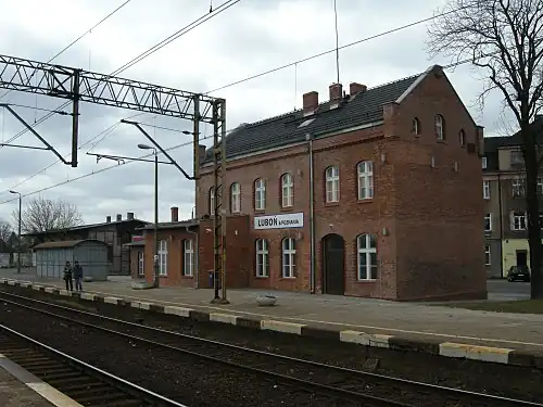 Luboń koło Poznania railway station is a railway station serving the town of Luboń, in the Greater Poland Voivodeship, Poland. The station opened on 29 October 1896 and is located on the Wrocław–Poznań railway and Sulechów–Luboń koło Poznania railway. The train services are operated by Przewozy Regionalne and Koleje Wielkopolskie.
