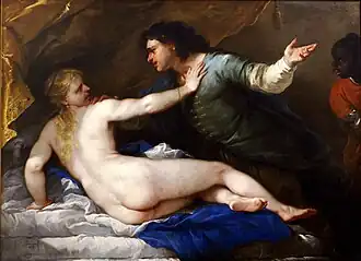 - ^ Woermann 1908, p. 176, no. 486: "On the left the blonde Lucretia, naked, seen half from behind, under a yellow curtain on her snowy bed. Half-erect, she leans on her left arm, while she raises her right hand defensively against Tarquinius, who grabs her with one hand and points to the right with the other, where his negro slave is standing."