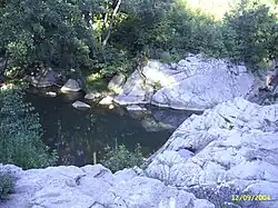 The Luda Kamchia River originates from a spring at an altitude of 1,109 m on the north foothills of Mount Vratnik in the Sliven Mountain division of the Balkan Mountains. It flows in a deep forested valley, covered with deciduous woods. The valley widens downstream from the village of Gradets and forms large meanders. From the source to the village of Daskotna the Luda Kamchiya flows in general an easterly direction between the Razboyna Ridge, Kotlenska Mountain and Varbishka Mountain to the north and the Sliven, Stidovska and Karnobat mountains to the south, all of them subdivisions of the Balkan Mountains. It then turns northeast, forming the deep Luda Kamchiya Gorge between the Varbishka Mountain to the northwest and the Kamchiyska Mountain to the southeast, exiting the gorge at Tsonevo. The river joins the Golyama Kamchiya at an altitude of 26 m at village of Velichkovo, giving rise to the Kamchiya river proper.[1][2]