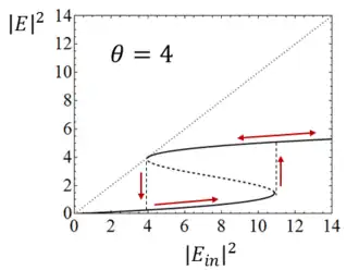 The curve is -shaped and there is an interval of values of where one has three stationary states. However, the states that lie in the segment with negative slope are unstable, so that in the interval there are two coexisting stable stationary states: this phenomenon is called optical bistability.[11] If the input intensity is increased and then decreased, one covers a hysteresis cycle.