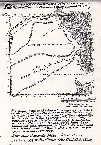 The Luis Maria Baca Grant No. 4, south of Crestone, Colorado, was a large land grant made in 1860 by the United States to the heirs of the original Vegas Grandes Grant to the Baca family of New Mexico in Las Vegas, New Mexico.[1][2][3] Title to the grant in Las Vegas was clouded by a second grant of the same land.[3] The Baca heirs were offered alternative lands from the public lands of the United States.[3] The largest of the tracts selected, near what is now Crestone,[3] was 12.5 miles (20.1 km) on a side and was located to the south of what is now Saguache County Road T, about 1-mile (1.6 km) south of the 38th parallel. The Bacas deeded the land to their attorney, John Sebrie Watts, but it soon passed by tax sale to a third party. The ranch headquarters was on Crestone Creek to the southwest of Crestone. The Baca Grant was one of the first large tracts of land to be fenced in the West and in its heyday was the home of prize Hereford cattle.[4]