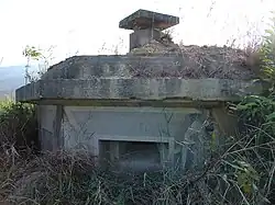 Luk Keng is the site of a World War II network of defense, comprising a trench system and 14 pillboxes, built by the Japanese using forced local labor during the later years of the Japanese occupation of Hong Kong. The network is located on a 120 m hill overlooking Starling Inlet.[9][10][11] Originally thought to be aimed at coping with an anticipated Allied landing in the Mirs Bay Area, it is later believed by scholars that it is mainly used for suppressing local anti-Japanese activity and infiltration from the mainland.[12][notes 1] In 2009, the Luk Keng Pillboxes and Observation Posts have been listed as Grade II historic buildings.[13]