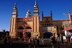 The iconic 9-metre wide (30 ft) smiling face, as well as its Art Deco towers, have presided over the main entrance for almost all of the park's existence. The idea was based on the large smiling faces at Luna Park, Melbourne, Australia, and Steeplechase Park in the United States.