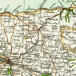 Chelfham (pron. Chellam) is reached by a fine viaduct over the tributary stream, where 2 miles (3.2 km) east stands Stoke Rivers, through which the above round might be extended. The line has now left the Yeo, mounting eastward up the Bratton Valley to Bratton Fleming Station near the lofty village of Bratton Fleming. The next station is Blackmoor (900 ft), lying under the tumuli of Kentisbury Down to the left, whence one might descend on foot to Lynton and Lynmouth (7 miles) or Ilfracombe (10 miles) from the crossroads at Blackmoor Gate.