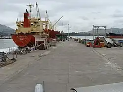 Lyttelton Port wharves 2, 3, 4, 5, 6, and 7. In the background at left is part of the oil terminal.