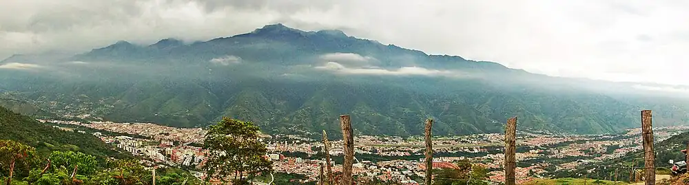 ![]() ![]() ![]() ![]() ![]() Top:Panoramic view of a residential area of Mérida and Albarregas River, Second:Panoramic view of southern Zumba area, Mérida main Cathedral and Arzobispal Palace in 4th Bolivar Avenue, Third:Mukumbari Cable Car, nearby La Montana, Campo Elias Viaduct across Albarregas River, Bottom:Panoramic view of Mérida City, View of Pico Bolivar from Mérida (all items from left to right) | |