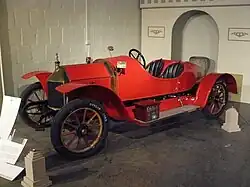 The first cars were 4.5 hp (3.4 kW) 2-cylinder models with chain drive. In 1900, the company switched to shaft drive.[1] In 1905 an all-new range was introduced, resembling contemporary Daimlers, both designed by Ernst Lehmann, who come to Métallurgique from there in 1903.[2] These cars, with pressed-steel chassis, live rear axle, shaft drive,[3] high-tension ignition,[4] and the option of dynamo-powered[5] electric lighting, were to establish the company as one of the finest makers of sporting cars in Europe. Production was targeted for export, and most sales were in Britain.[6] In 1906, there came the 4-cylinder inlet over exhaust 10 L (610 cu in), with a claimed output of 100 bhp (75 kW) at 1400 rpm, enabling the car to reach 160 km/h (99 mph).[7] The cars got a distinctive V front radiator in 1907.[8]