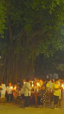 At times, special events are also held, such as a recital of the entire Buddhist scriptures and ceremonies for avowing oneself as a Buddhist lay person.[50] The Dhammakaya Temple is particularly known for its visually grand celebration.[51][52]