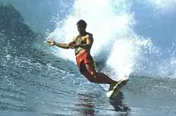 Surfing is sometimes recognized as starting in Mākaha in the early 1950s, even though it has most likely been utilized as a surfing spot for Native Hawaiians for hundreds of years.[6][19] During summer, the waves tend to be at maximum four feet; however, during the winter surf season, the waves often exceed fifteen feet.[4] Attracted by these waves, sometimes as high as 25 feet high, the Waikīkī Surf Club established the Mākaha International Surfing Championships in 1952, the first of the many international surfing contests that are now held in Hawaii. One of the most popular events still held at Mākaha is Buffalo's Big Board Contest, an annual surf contest named in honor of Mākaha lifeguard and surfing legend Richard “Buffalo” Keaulana. In these waters, Buffalo not only invented some of the most outrageous methods of surfing, but also raised his world champion son Rusty. He also made Mākaha the home of the world's first international surf meet in 1954 and still hosts his Big Board Surfing Classic.[21][22] Rell Sunn's Menehune Triple Lei of Surfing is another annual surfing event that finds place in Mākaha.[3] Besides Mākaha Beach Park, other surfing areas in Mākaha includes for instance Aki's Beach,[23] the Blowhole,[24] Bowl,[25] Charlie's Reef,[26] and Cornets.[27] water