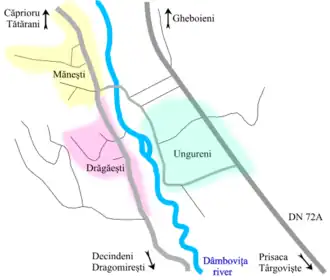 It is composed of three villages: Drăgăești-Pământeni (colloquially "Drăgăești"), Drăgăești-Ungureni (colloquially "Ungureni"), and Mănești. Mănești and Drăgăești are on the right bank of the Dâmbovița River, while Ungureni is on the left bank.