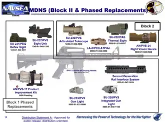 In 1992, U.S. Special Operations Command (USSOCOM) developed the Special Operations Peculiar Modification (SOPMOD) Block I kit for the carbines used by US Special Operations Forces units operating under its command.[64] The kit features an M4A1, a Rail Interface System (RIS) handguard developed by Knight's Armament Company (KAC), a shortened quick-detachable M203 grenade launcher and leaf sight, a KAC sound suppressor, a KAC back-up rear sight, an Insight Technologies AN/PEQ-2A visible laser/infrared designator, along with Trijicon's ACOG TA-01NSN model and Reflex sights, and a night vision sight, among many other accessories.[65] This kit was designed to be configurable (modular) for various missions, and the kit is currently in service with special operations units.[64]