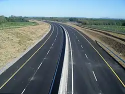 The construction of the Nenagh to Limerick section was slow and difficult. Work on this section began on 7 December 2006 and was initially due to be completed in May 2009.[4] The total length of the scheme is 38 km (24 mi), of which 10 km (6.2 mi) was the upgrading of the single carriageway Nenagh bypass. The road opened in three stages. The Nenagh bypass re-opened to motorway standard on 17 December 2009 and the Nenagh to Birdhill section opened on 1 April 2010. Problems were encountered while constructing the road over two sections of deep bog at Annaholty and Drominboy near Birdhill and this delayed the opening of the Birdhill to Limerick section by over a year. Parts of the road collapsed over the two bogs and the sections were rebuilt and opened on 28 September 2010.[5] This scheme was originally to be built as a high-quality dual carriageway (HQDC), but it was re-designated motorway by Statutory Instrument on 17 July 2008.