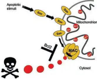 Members of the Bcl-2 protein family regulate apoptosis by controlling the formation of MAC: the pro-apoptotic members Bax and/or Bak form MAC,[1][5] whereas the anti-apoptotic members like Bcl-2 or Bcl-xL prevent MAC formation. Once formed, MAC mediates the release of cytochrome c to the cytosol, triggering the commitment step of the mitochondrial apoptotic cascade. Depletion of MAC activity is accomplished pharmacologically by specific compounds, namely Bax channel inhibitors[6] and MAC inhibitors.[7] Either by knocking down MAC's main components or by its pharmacological inhibition, the end result is prevention of cytochrome c release and apoptosis.