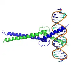 19. ^ a b Nair SK, Burley SK (January 2003). "X-ray structures of Myc-Max and Mad-Max recognizing DNA. Molecular bases of regulation by proto-oncogenic transcription factors". Cell. 112 (2): 193–205. doi:10.1016/S0092-8674(02)01284-9. PMID 12553908. S2CID 16142388.