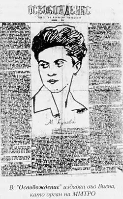 Newspaper "Osvobojdenie" (Liberation) issued from MMTRO in Vienna, with an article about Mara Buneva on its first page.
