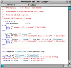 MPW 1.0 was completed on September 24, 1986. A shell memory leak was fixed on October 10, 1986, and MPW 1.0.1 was born. MPW 2.0 was completed on July 20, 1987. MPW 3.0 was done November 30, 1988 and included a completely new C compiler.[7] Around the same time, the beta version of the C++ compiler as well as MacApp 2.0 (for Object Pascal) were made available.[8] MPW 3.1 and 3.2 came in the next few years, with MPW 3.3 released in May 1993, adding distributed tools support and incremental linking.[9] MPW 3.4 was completed July 14, 1995, and MPW 3.5 was done December 17, 1999. MPW 3.6 was under development when work was halted in late 2001.