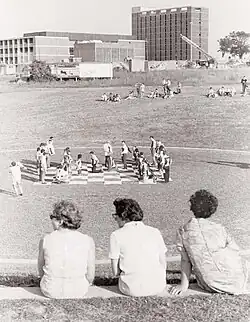 In 1973, the student union (MUSC) worked with the Builders Labourers Federation (BLF) to organise one of the first "pink bans".[27] Similar in tactic to the green ban, the pink ban was recommended when one of the residential colleges at Macquarie University, Robert Menzies College, ordered a student to lead a celibate life and undertake therapy and confession to cure himself of his homosexuality. The BLF decided to stop all construction work at the college until the university and the College Master made statements committing to a non-discriminatory university environment. MUSC was successful in engaging with the BLF again in 1974 when a woman at Macquarie University had her NSW Department of Education scholarship cancelled on the basis that she was a lesbian and therefore unfit to be a teacher.[28]
