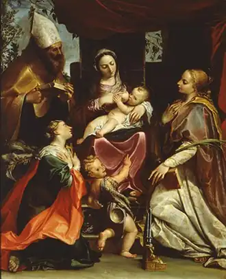 Madonna and Child with Saints is an oil painting on canvas by the Italian painter Agostino Carracci, from 1585, dated on the lowest step of the Virgin Mary's throne. An example of a sacra conversazione. Long in the Benedictine abbey of San Paolo in Parma, French troops took it to Paris in 1796 and on its return to Italy in 1816 it was moved to the Galleria nazionale di Parma, where it still hangs.[1]