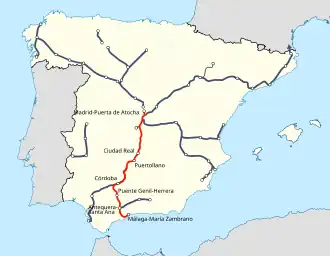![]() Madrid-Málaga high speed rail line in red | ||||||||||||||||||||||||||||||||||||||||||||||||||||||||||||||||||||||||||||||||||||||||||||||||||||||||||||||||||||||||||||||||||||||||||||||||||||||||||||||||||||||||||||||||||||||||||||||||||||||||||||||||||||||||||||||||||||||||||||||||||||||||||||||||||||||||||||||||||||||||||||||||||||||||||||||||