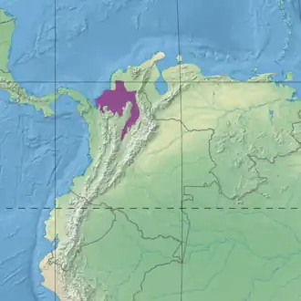 The ecoregion is in the Neotropical realm, in the tropical and subtropical moist broadleaf forests biome.[1] The Magdalena–Urabá moist forests ecoregion links the Central American and Chocó ecoregions with the ecoregions of the Andes and the Amazon basin. It has high diversity of species and a high level of endemism.[3] The ecoregion is sometimes seen as the eastern part of the Chocó, but it has different characteristics and different endemic species.[3]