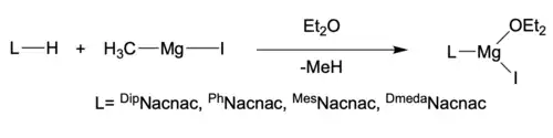 The stability of the Mg-Mg bond needed to be dealt with. Researchers began to investigate sterically demanding guanidinates and amidinates. Their stabilizing abilities in low-oxidation state chemistry was attractive since it allowed for other low-valent main group complexes to be achieved.[8] This research also allowed for the first stable dimer Mg(I) dimer, [{(Priso)Mg}2].[9] Potassium reduction of heteroleptic Mg(II) iodide precursor complexes were then carried out. The ligands guanidinato and, β-diketiminato Mg(II) iodide etherate complexes can be prepared from free NH ligands and methyl magnesium iodide in diethyl ether. An example of the synthesis of the precursor synthesis can be shown below.[10] An additional precursor synthesis is shown, needed for [{(tBuNacnac)Mg}2], which can be explained in the section below.