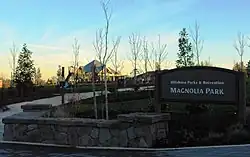 Magnolia Park is 3.11 acres (12,600 m2) in size and is the city's easternmost park.[5] The park is located in the Tanasbourne neighborhood and was adopted by the Trader Joe's store as part of Hillsboro's adopt-a-park program.[5] Magnolia is between Cornell and Walker roads and surrounded by a retail development that includes Whole Foods, a retirement community, and condominiums.[3] Amenities at the park include a water fountain designed for children to play in,[6] walking areas, open grass areas, children's play equipment, athletic equipment, natural areas, and a covered picnic area.[7]