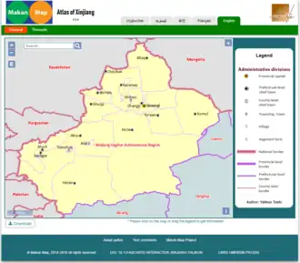 The Makan Map is an online interactive atlas of the Xinjiang Uyghur Autonomous Region of China.[1][2][3][4] This region covers an area of 1,664,897 km2, or 16% of China's territory. It allows to visualize geographic, administrative and socio-economic baseline data, to carry out statistical analysis and to create thematic maps for this region.[5] The Makan Map is the first multi-language atlas of the Xinjiang.[6] It has been created in four languages: Uyghur, Chinese, French and English. The current version is the second version of the Makan Map.[1] Development is ongoing for future releases.[6]
