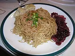 - Cantonese fried noodles (Chinese: 廣府炒麵) refers to a preparation of noodles which are shallow- or deep-fried to a crisp, then served as the base for a thick egg and cornstarch white sauce cooked with sliced lean pork, seafood, and green vegetables like choy sum. A related dish called wa tan hor (Chinese: 滑旦河) uses hor fun noodles, but the noodles are not deep-fried, merely charred. Another variation called yuen yong (Chinese: 鴛鴦) involves mixing both crisp-fried rice vermicelli as well as hor fun to form a base for the sauce.