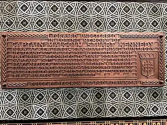 His name appears with 41 others on a memorial honour board, displayed at Duntroon, commemorating the memory of the 42 graduates of the Royal Military College of Australia who died during their military service in the Great War.[13] and the Greensborough District's War Memorial Cenotaph.[14][15] At evensong on Friday 23 November 1928, a memorial tablet dedicated to Malcolm Kennedy was unveiled by the Anglican Archbishop of Melbourne, Harrington Lees, on the eastern wall of St Paul's Cathedral, Melbourne.[16] The tablet's inscription read: