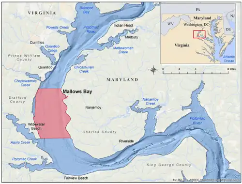 The Mallows Bay–Potomac River National Marine Sanctuary is located in an 18-square-mile (47 km2) portion of the Potomac River in Charles County, Maryland. It lies off the Nanjemoy Peninsula, about 40 miles (64 km) south of Washington, D.C.[2][3][7]