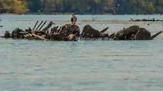 Over time, the shipwrecks of the "Ghost Fleet' have transformed into distinctive, skinny, vegetation-covered artificial islands which provide island, intertidal, and underwater habitats that support a diversity of coastal and marine life, including an abundance of fish, American beavers, and birds such as ospreys, great blue herons, and bald eagles.[10][11] Sediment and seeds deposited inside the hulls of the wrecks have turned some of them into islands often referred to as "flowerpot" wrecks,[25] while others have fused to the shore and form artificial peninsulas which stabilize the shoreline and have a lush covering of plant life.[25] Eastern redcedar (Juniperus virginiana), paw paws of the genus Asimina, persimmon trees, marsh tickseed (Bidens trichosperma), and pickerel weed of the genus Pontederia grow on the wrecks, providing a home for various animal species including ospreys, who visit the sanctuary each spring and summer and build their nests on the wrecks.[25][26] At least one beaver lodge has been noted on a wreck.[25] Vegetation on the wreck of SS Afrania includes swamp dogwood (Cornus amomum), yellow iris (Iris pseudacorus), drooping star of Bethlehem (Ornithogalum nutans), false indigo (Amorpha fruticosa), and a 33-foot (10 m) tall American elm (Ulmus americana).[13]