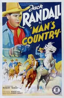 Man's Country is a 1938 American Western film directed by Robert F. Hill and written by Robert Emmett Tansey. The film stars Jack Randall, Marjorie Reynolds, Walter Long, Forrest Taylor, and David Sharpe. The film was released on July 6, 1938, by Monogram Pictures.[1][2][3]