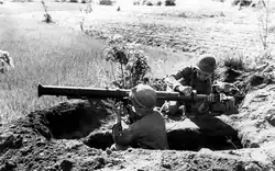 Portable anti-tank systems initially appeared in the form of heavy rifles – so called anti-tank rifles – during the First World War and interwar period. These soon got replaced with recoilless systems with the application of the shaped charge explosive projectiles during the Second World War.[1] The development of practical rocketry and recoilless cartridges occasioned by World War II provided a means of delivering such an explosive from a shoulder-launched weapon, leading to a new type of weapon family which combined portability with effectiveness against armoured vehicles, fortifications, and buildings. Famous early examples includes the American bazooka-family of reloadable rocket launchers, the German Panzerfaust single-shot disposable anti-tank launcher and the post war Swedish Carl Gustaf 8.4 cm recoilless rifle. The war also saw the use of a variety of unconventional MPAT-systems, such as the German Hafthohlladung magnet mine, the Japanese Shitotsubakurai lunge mine, the British sticky bomb hand grenade and PIAT direct fire spigot mortar.