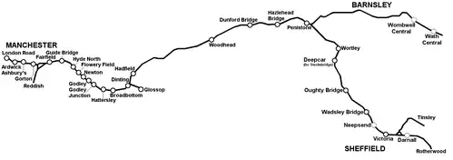 Minor electrified branches off the main line ran to the locomotive depot at Reddish on the Fallowfield Loop line, to Glossop (for local passenger trains), Dewsnap sidings (all at the Manchester end) and Tinsley Marshalling Yard (at the Sheffield end).
