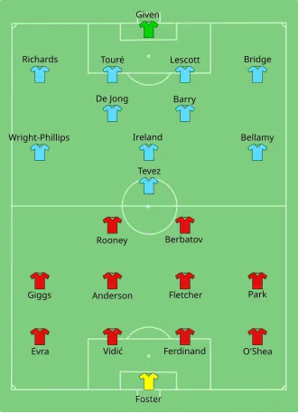 The match kicked off at around 13:30 BST in front of a crowd of 75,066 at United's Old Trafford stadium.[47] United took the lead inside two minutes; a quick throw-in by Giggs gave Evra the space to run past Shaun Wright-Phillips and play the ball to Rooney, who sidestepped Touré and De Jong before sliding the ball past Shay Given.[48] After a quarter of an hour, a long ball by City defender Joleon Lescott looked to be heading straight to Ben Foster, but Tevez managed to get there ahead of the United goalkeeper and set up Gareth Barry for the equaliser.[47][48] The first yellow card was given to Tevez for a "clumsy lunge" on Ferdinand in the 27th minute,[49] and in the 36th minute Tevez was the recipient of a heavy tackle from Anderson, who himself was booked for the challenge.[49] In the 44th minute, Vidić also picked up a yellow card for a foul on Micah Richards,[49] and a minute later Tevez nearly gave City the lead, hitting the outside of the post following good team play involving Touré and Ireland.[50] At half-time, as the players were leaving the pitch, Tevez responded to a hostile reception from the Stretford End by applauding "sarcastically".[51] Moments later, a coin thrown from the stands struck Tevez's teammate Javier Garrido on the head.[52][53]