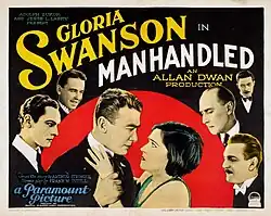 Manhandled is a 1924 American silent drama film directed by Allan Dwan and starring Gloria Swanson. The film was produced by Famous Players–Lasky at their East Coast Astoria Studios facility and distributed by Paramount Pictures. The supporting cast includes Frank Morgan.[1] A young woman goes out partying when her hard-working boyfriend neglects her.