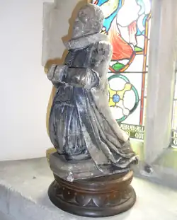 Philip III Courtenay (1547–1611) (son by first wife Dorothy Pollard), married Joane Boyes (died 1586), daughter of John Boyes of Kent. One of their daughters, Lydia, married Richard Culme in Molland Church. Their daughter Elizabeth Courtenay (died 1624) married in 1600[56] to the Hollander Peter Muden, a doctor of medicine, of Butterleigh, three miles south-east of Tiverton. Muden reconstructed Butterleigh parish church[57] and later erected in it a mural monument to his wife which included a female effigy between two children with verse,[58] of which only one fragment survives, a small alabaster statue of a kneeling man.