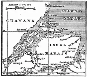 The Marajó várzea is at the mouth of the Amazon River. It covers coastal areas of the states of Pará and Amapá, with an area of 8,857,759 hectares (21,888,000 acres).[1] Water levels are affected by freshwater flowing down the river and by tidal flows from the Atlantic Ocean.[2] The várzea forest in the ecoregion starts where the Xingu River joins the Amazon, which begins to broaden out. It covers the west of Marajó Island and many smaller islands in the Amazon channel, as well as parts of the mainland to the north and south of the river mouth including a small area of French Guiana.[3] The nutrient-rich sediments from the river are deposited on the islands.[3]