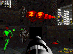 Gameplay takes place in a real-time, 3D-rendered world of ceilings and floors of various heights and widths, all viewed from a first-person perspective. All surfaces in the game are texture mapped and have dynamic lighting. The player assumes the role of a nameless security officer aboard a large colony ship called the Marathon, constructed from Mars' moon Deimos. The player controls the movement of their character primarily through use of the keyboard. Using assignable keys, they can move forward and backward, turn left or right, sidestep left or right, look up, down or forward, and glance left or right. Marathon also features free look, allowing the player to use the mouse to fire weapons and rotate their character's view. Marathon was one of the earliest computer games to employ free look and give the player the ability to look up or down.[3] The game interface includes an overhead map, a motion sensor indicating the positions and movements of both enemies and allied characters through red triangles and green squares respectively, and bars displaying the player's current shield and oxygen levels.