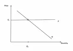 This is the case as a company will only produce while the price is greater or equal to the marginal cost, given by the supply curve, and the consumer will only buy the good if the demand at that quantity is greater than the cost.[8] The intersection point is consequently equilibrium as it is the price and quantity where a goods supply would equal its demand.[6] Any natural deviation from this equilibrium would be naturally resolved within a competitive environment and return to this state.