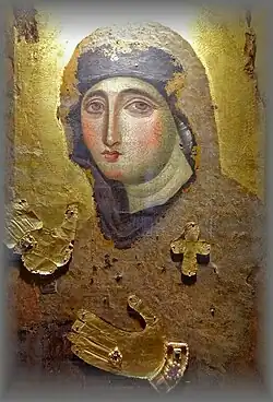 The Madonna del Rosario is an icon of Mary commonly dated to the sixth century or earlier.[1] It is an early version of a type of icon known as the Agiosoritissa or the Maria Advocata, in which Mary is depicted without the Christ Child, with both hands raised. The work, which has been kept in the Church of the Madonna del Rosario since 1931,[2] is thought to be the oldest extant image of Mary in Rome, Italy.[3] Medieval tradition held that the icon was painted by Luke the Evangelist.[4]