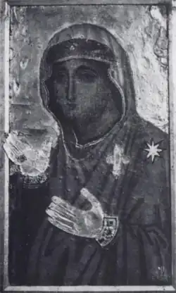 The linden wood on the painting ground is badly eaten away, but the portrait as a whole, especially the face, the gold nimbus and one hand, are still clearly visible.[2] In later times, Mary's interceding hands were covered with gold sheets to protect them from devotional kisses, and a gold cross was added to her shoulder.[3]
