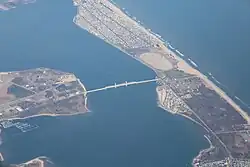 The Marine Parkway–Gil Hodges Memorial Bridge (originally and often referred to as the Marine Parkway Bridge) is a vertical-lift bridge in New York City, New York, that crosses Rockaway Inlet. The bridge, which opened on July 3, 1937, connects the Rockaway Peninsula in Queens, with Flatbush Avenue to Floyd Bennett Field, Belt Parkway, and the Marine Park neighborhood in Brooklyn. The bridge is designated as New York State Route 901B, an unsigned reference route.[3]