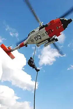 A Maritime Safety and Security Team member conducts a vertical insertion from an HH-60 Jayhawk helicopter