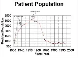 In March 1931, five buildings were completed to accommodate 500 patients. A few months later in June, a total of six buildings were completed and four more patient cottages were almost complete. The hospital was originally envisioned as being a "self contained community".[30] Originally intended to house a population of 2000 patients; however, 3000 patients was reached in 1933.[31] In 1937 funds from the WPA were used for a building, added to accommodate 650 additional patients.[32][33] In 1939 three additional administrative buildings, silos, barns and some other out buildings were constructed.[34][35] Overcrowding was again addressed in 1944 with the passage of a bill authorizing $400,000 part of which was for emergency construction of two dormitory units designed for 80 patients each.[36] Continued to be overcrowded, the hospital population was reported to be 2812 in December 1945.[37] A state review of the hospital in 1947 showed a census of 2736 patients. The review further stated "the scenes in the crowded quarters for senile patients were not such to make anyone proud of the support... given to this needy group."[38] In 1949, Dr. Gordon stated that "patient wards have been established in basements, sun porches and corridors."[39] In 1951, $300,000 was appropriated for a 280-bed building which was constructed for senile patients.[40] State voters provided a $730,000 bond for the construction of four dormitory structures on the property and provide an additional 312 beds.[41] In 1977, the aging hospital required some capitol environmental improvements, electrical upgrades, roof repairs and new boilers. Money was appropriated for these updates in 1975 bond vote.[42] In 1987, a $4 million plan to rebuild parts of the hospital included a second admission unit, two more patient cottages, and conversion of medical services building to a day activity center.[43]