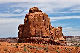 Mars Hotel is located within Arches National Park,[3] and like many of the rock formations in the park, it is composed of Entrada Sandstone, specifically the Slick Rock Member overlaying the Dewey Bridge Member.[4] It is among the first features that the main park road passes by. Topographic relief is significant as the summit rises approximately 250 feet (76 meters) above the surrounding terrain in 500 feet (152 meters) laterally. Precipitation runoff from Mars Hotel drains to the nearby Colorado River via Courthouse Wash. The first ascent of the summit was made in March 1989 by Kyle Copeland and Eric Johnson via If I Only Had A Brain rock-climbing route (class 5.10).[5] Mike Baker and Leslie Henderson climbed a new route in 1992 on the east face, Lost in Space (class 5.10+).[2][6]