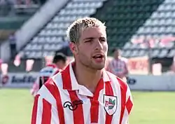 Palermo had a slow to start with Boca Juniors.[4] In their seventh match of the 1997 Apertura on 30 September 1997, he scored his first goal in a 2–1 victory against Independiente.[5] In 1999, Palermo's good goal average and performances with Boca and with the Argentina national team led European teams Lazio, Real Betis, and Milan to be interested in signing him up.[6] But on 13 November 1999, in a game against Colón, he had a complete tear of the anterior cruciate ligament of his right knee; before leaving and without knowing the seriousness of the injury, he scored his 100th goal in the Argentine First Division.[7]